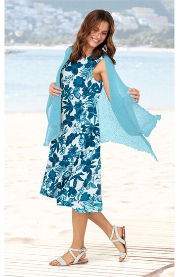 Aus eins mach zwei! Wende-Trägerkleid mit zwei verschiedenen Tragevarianten in weiß-blau bedruckt und in türkis-blau bedruckt. A-Linie, Rundhals-Ausschnitt mit kleinem V-Ausschnitt. Seitennahttaschen.