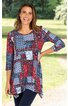 Leicht ausgestelltes Tunika-Shirt im Single-Jersey-Crêpe mit Allover-Druck-Dessin, paspeliertem Rundhals-Ausschnitt, vertikaler Teilungsnaht im Rückenteil. Weitschwingender Saum in Zipfeloptik, Seitenschlitze. 3/4-Arm.