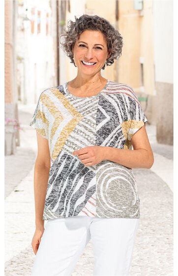 Attraktives Jersey-Shirt mit grafischem Druck auf lebhafter Ausbrenner-Qualität. Rundhals-Ausschnitt, angeschnittener Kurzarm.