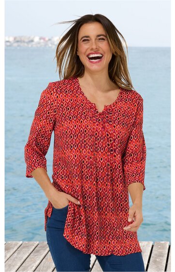 Tunika-Schlupfbluse in Viskose-Crinkle-Qualität mit kleinem, grafischem Druck-Dessin. Paspelierter Rundhals-Ausschnitt mit Schlitz und Schlaufenverschluss. Biesenpartie rechts und links entlang der Knopfleiste. Kleine Seitenschlitze und 3/4-Arm.